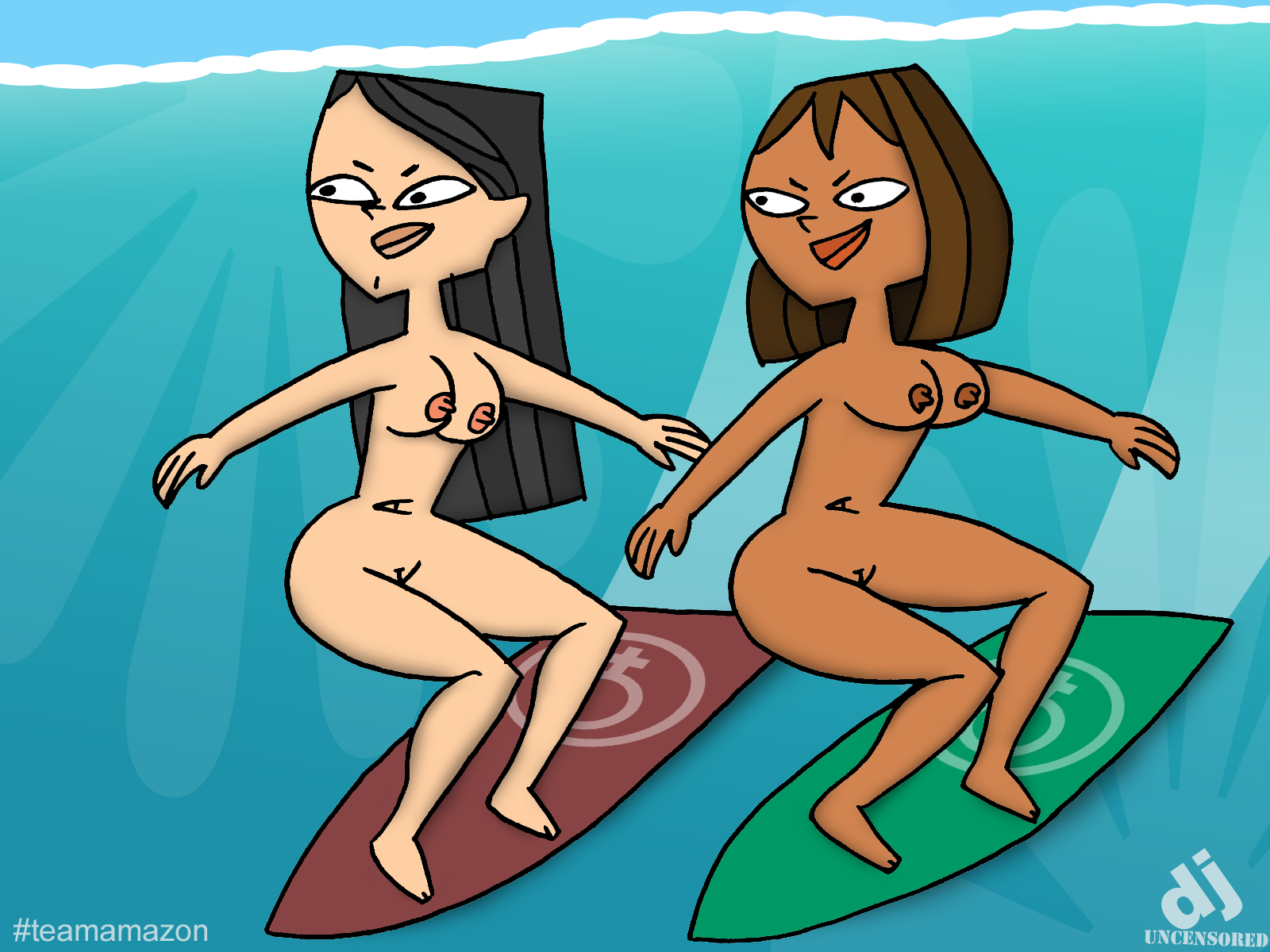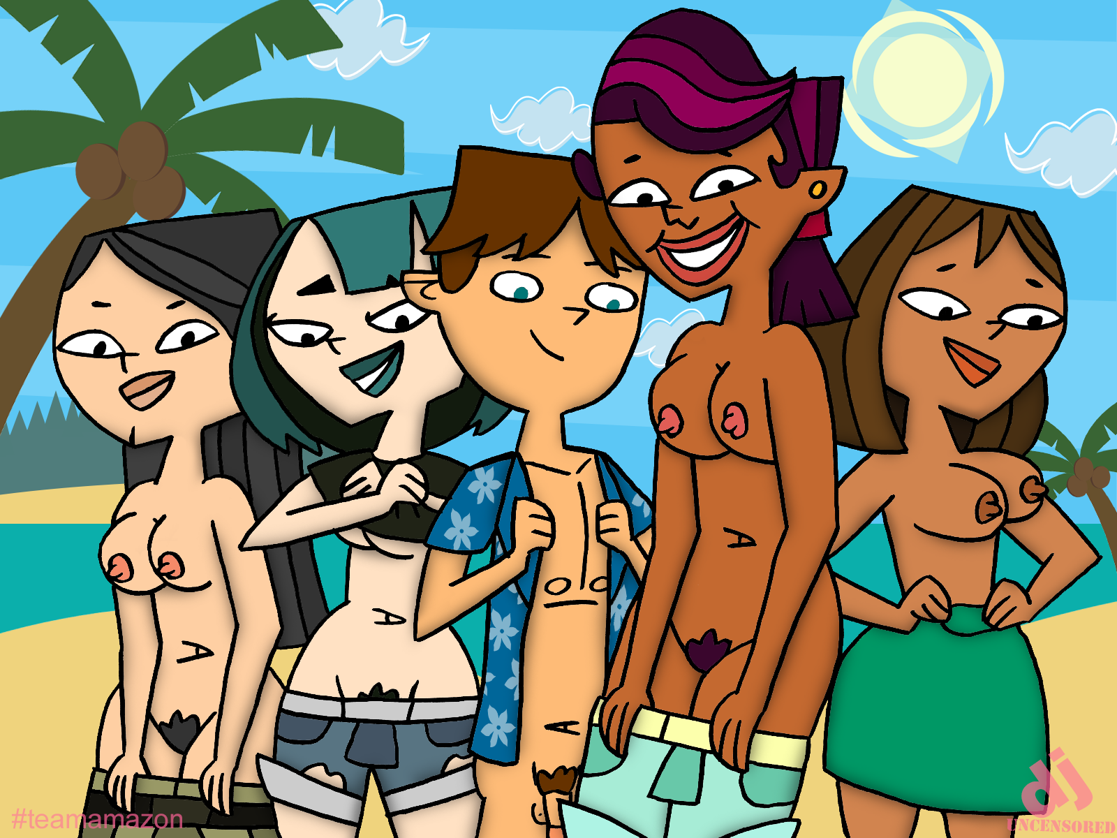 I was planing to do one post before starting another, but already finished both pics so why not. Here some more Team Amazon at a nudist beach; with Cody putting sun lotion on a girls backs.